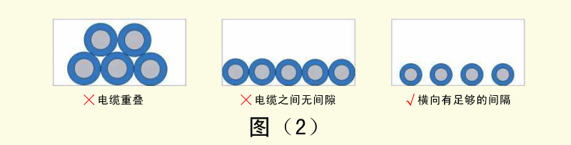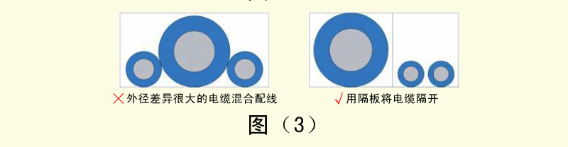 4、外徑差異很大的電纜如果混合配線,容易導致細線被粗線壓迫,造成細線容易斷線。這時需要用隔板將電纜隔開。如圖(3)